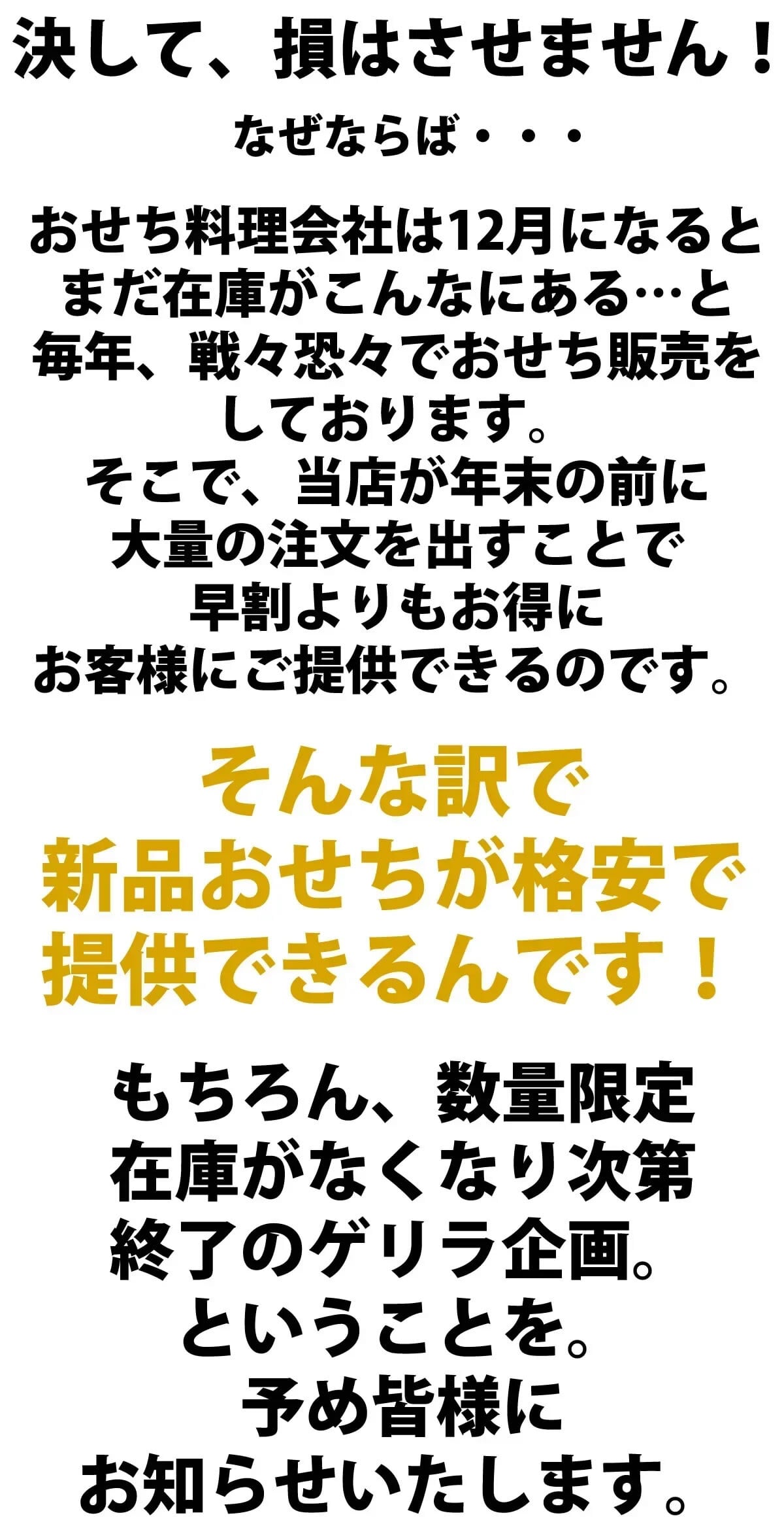 4.ゲリラ企画のため、「福おせち」に関しての問い合わせは一切お受けできません。問い合わせいただいても一切返信はいたしません。住所変更等も対応できませんのでしっかりと正しい情報でのご購入をお願いします。